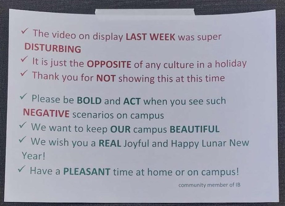 This note (a total of 6 of them) was plastered across the art display of 杨振中 Yang Zhenzhong’s “消毒 Disinfect”, a feature of 18 individuals as they scream, cry, and belittle the viewer. I’m sure you, the reader, may have seen these figures on your way into the IB’s lobby. They are disturbing. They are surprising. They clearly made people angry. It is effective art, and that makes it beautiful. For reference, Yang Zhenzhong has been making visual mediums since 1994. He is a renowned creator, known for his conceptual pieces. “Disinfect” is no different and hence, Yang Zhenzhong’s vision deserves to be respected.